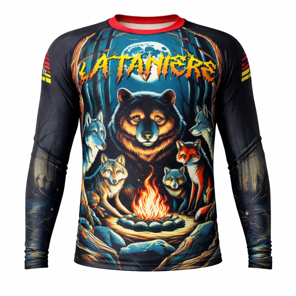 Rashguard manches longues à impression intégrale, inspiré de l’esthétique audacieuse des rashguards iconiques du no-gi moderne.