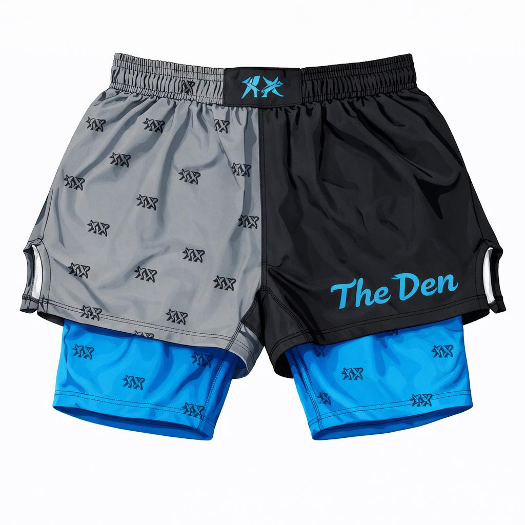 Short de grappling assorti au rashguard bleu et gris The Den.